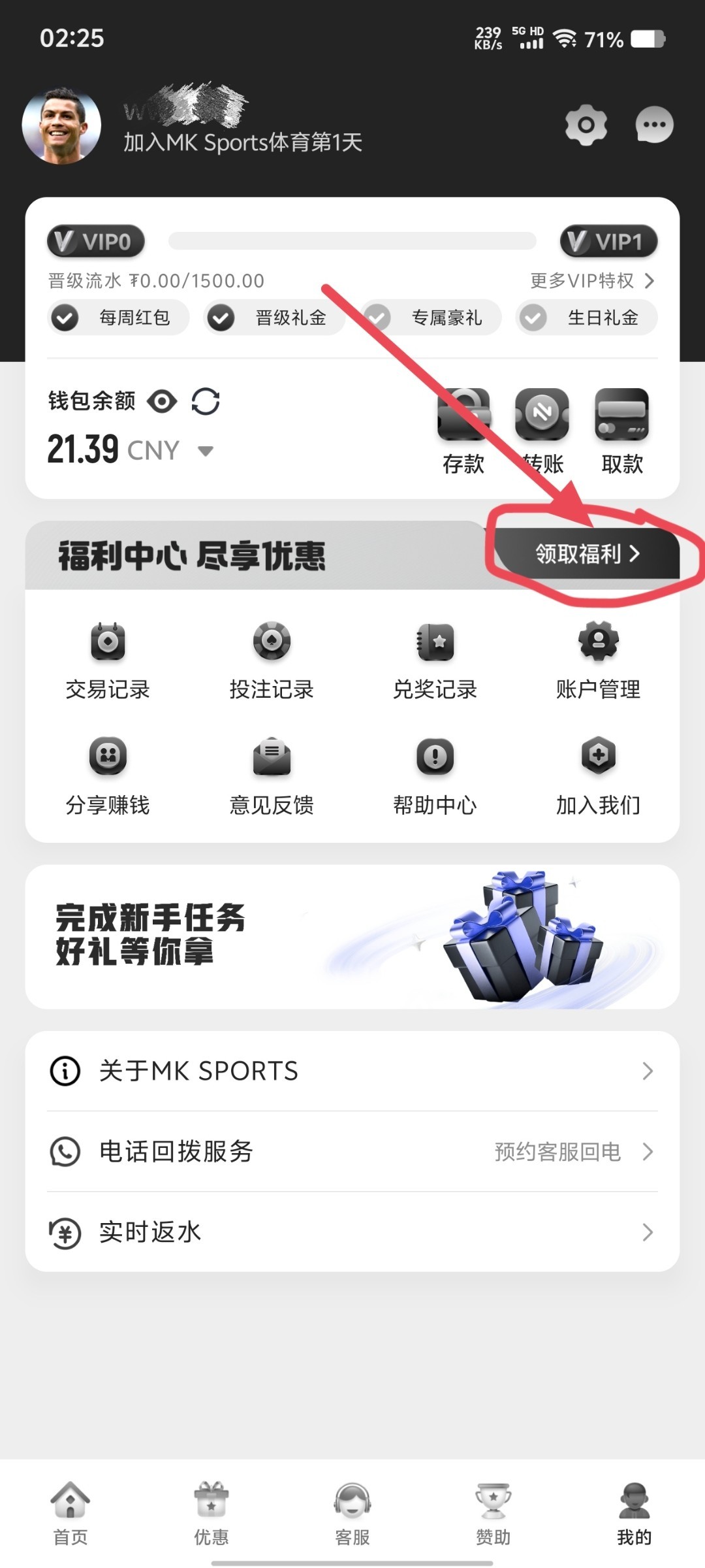 手机号和银行卡任务奖励是在福利中心领取