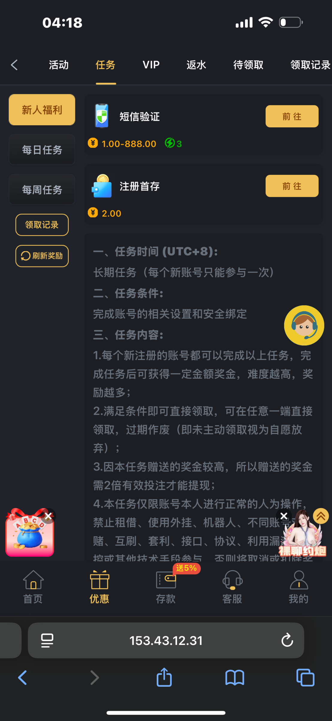 WNSR.vip赌神项目 新用户注册送优惠-任务里短信验证