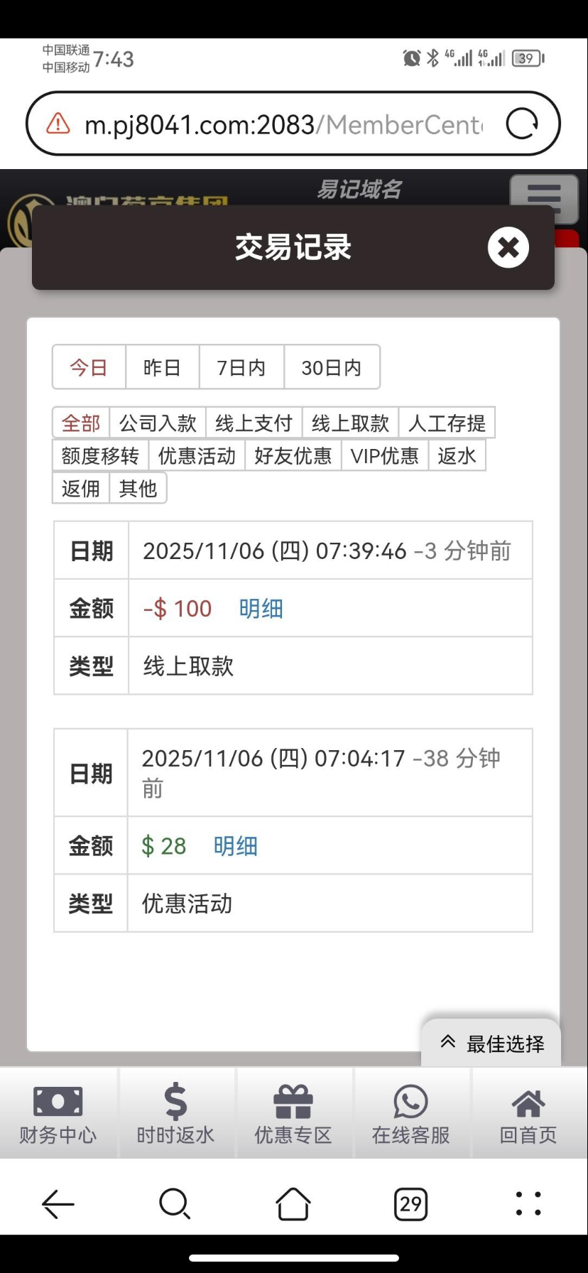 链接047.com 特邀送28,电话来的,不知道查不查,你们试试吧,有没有漏接的,找客服申请,直接爆id,跟他说申请电话回访特邀,我提100,切勿充值。有没有勿喷,只是怕有漏接的老哥没领到福利